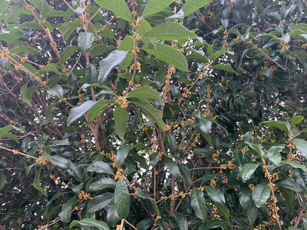 黄色い小さな花が少しだけ咲いたキンモクセイの木が・・・。