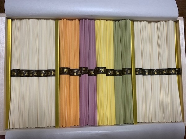 奈良のEさんから本葛入りの手延べそうめん(白)に小松菜(緑)、南瓜(黄)、紫芋(紫)、人参(赤)の彩り豊かな五色そうめんを頂きました。