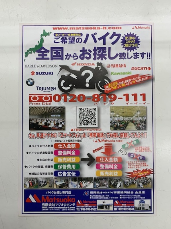 ネット販売との違いは購入後のメンテナンスを店頭展示バイクと同じ条件で受付られることです。