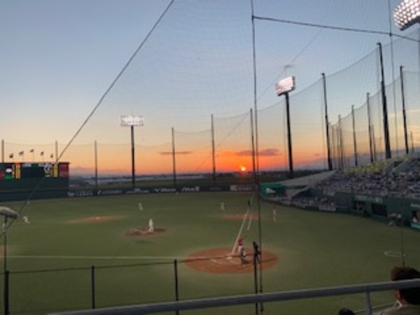 日没(18時28分)まで1時間半、気温37℃、真夏を思わせる熱い日射しが眩しい中で始まった試合。