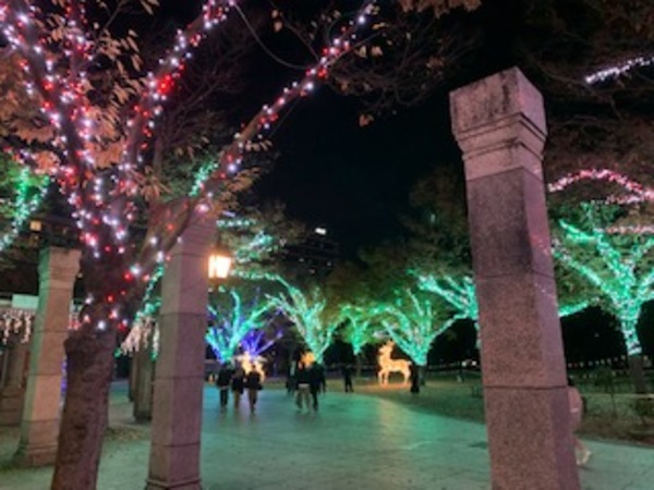 コンサート終了後、天神中央公園に出ると、そこは華やかなイルミネーションのドイツ・クリスマスマーケット!