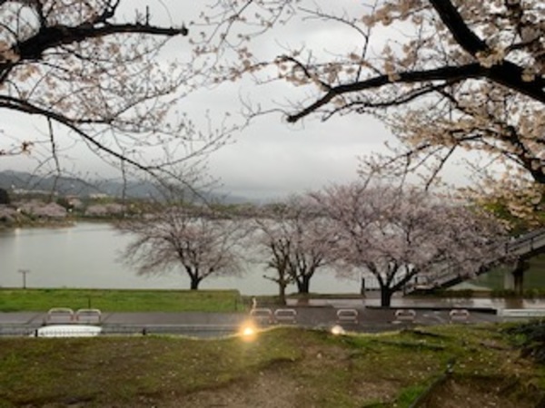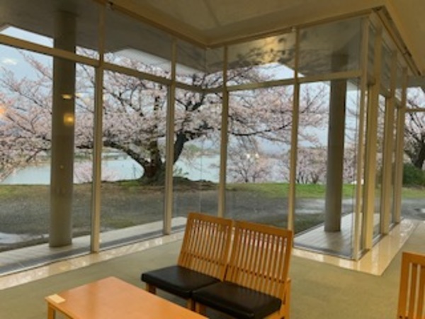 この日最後の目的地「さくらホール」があるサンレイクかすや(粕屋町立生活支援センター)に到着した頃には雨風が止み、ライトアップされた桜を見ながら散策できました。さすが100年に一度の大変革の年、私たちの他には誰もいません。今まで幾度となく訪れていますが、こんなことは初めてです。新型コロナ禍でも誰かしらいたのに・・・