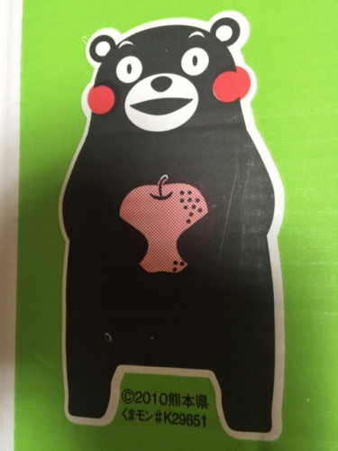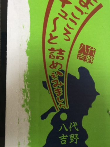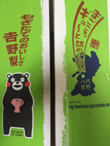 箱には 吉野梨を両手でかかえた「くまモン」のイラスト が左に、 熊本県八代市吉野の場所を表示した九州地図 が右に、 それぞれ描かれています。