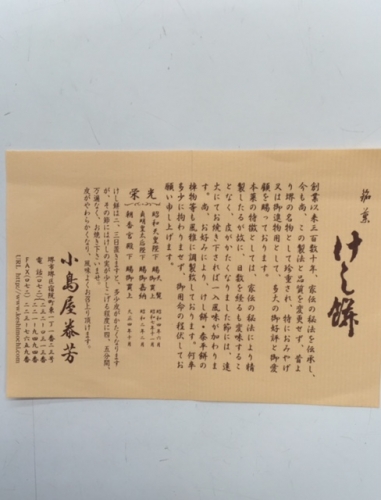 箱に入っていた説明文によると、 「創業以来三百数十年、家伝の秘法を伝承し、 今も尚、この製法と品質を変更せず、昔より堺の名物として珍重され、特におみやげ又は御進物用として、多大のご好評とご愛顧を賜っております。本菓の特徴としては、一家伝の秘法により精製したるが故に、日数を経るも変味することなく、皮がかたくなりました節には、遠火にてお焼き下されば一入風味が加わります。尚、・・・」